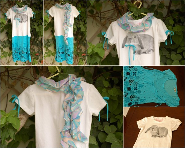 Kārtoju lielās meitas skapi, un atlasīju par mazu palikušos, un visādi citādi nelietojamos gabalus. Acīs iekrita divi krekliņi ar Lieldienu zaķiem. Pleķus gan nevar izmazgāt, tāpēc mēģinaju tos kaut kā radoši pārvērst no defektiem par efektiem. Talkā nāca pārpalikumi no kādas manis šūtas blūzes, un mans topiņš, kurā es vairs neietilpstu:) Process vēl nav pilnībā pabeigts, bet gribējās padalīties. Jā, un ārā atkal ir saulains!