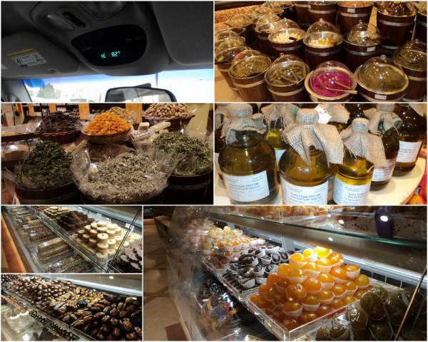 Mašīnas termometrs rāda jau 28 grādus plusā, un ir tikai aprīļa sākums!!! Mūkot no karstuma, ienirstam dažādu marinējumu, sacukurotu augļu, olīveļļas, dateļu un saldumu valstībā… Bildēts ar manu mazo kameriņu, un bēbi uz otras rokas:)