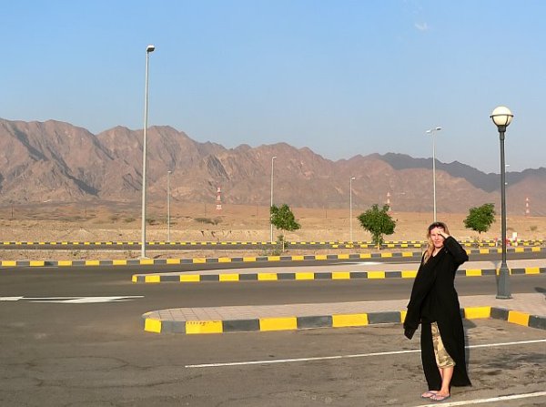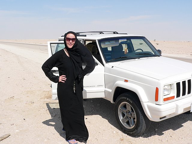 Un te bildes no 2005. gada, kad braucām uz Omānu. Ceļš no Katāras uz Omānu ved caur Saudu Arābijai, un, lai respektētu vietējās tradīcijas, es arī izmēģināju šo mistisko ietērpu – abaiju: