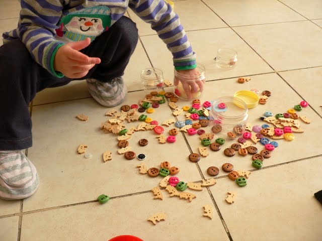 Sadzīvisko bildi tomēr paspēju ielikt – šeit mans uzticamais palīgs kārto manu pogu arsenālu:)