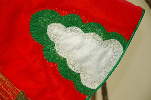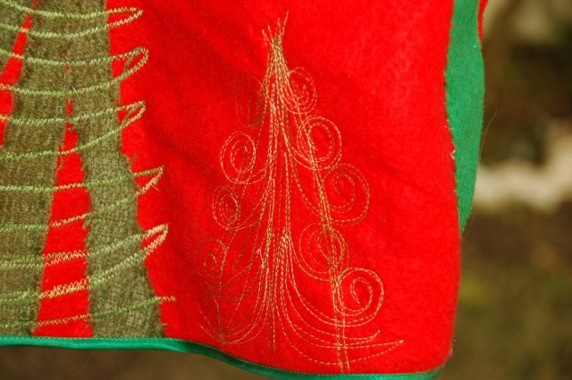 Es kaut kā biju iedomājusies, ka šis būs tāds vienvakara projektiņš, bet smagi nokļūdījos savos aprēķinos. Biju savā galvā iecerējusi “free motion” tehnikā izšūtas eglīties. Tādas arī man sanāca, bet viena vakara vietā, tas man paņēma trīs vakarus, un klāt pielika stīvus plecus. Šajā sakarā man ir šāds jautājums – kā jūs izvairaties no šādām ligām, ja gadās ilgstoši sēdēt pie šujmašīnas? Es laikam kaut kā nepareizi sēžu pie šujamrata…