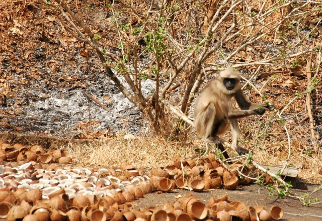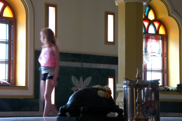 Pie (nosaukumu uz sitiena neatceros) tempļa mūs sagaidīja mazs pērtiķēns, kas karstajā dienasvidū grauza kokosriektus. Arī mums nedaudz tika.