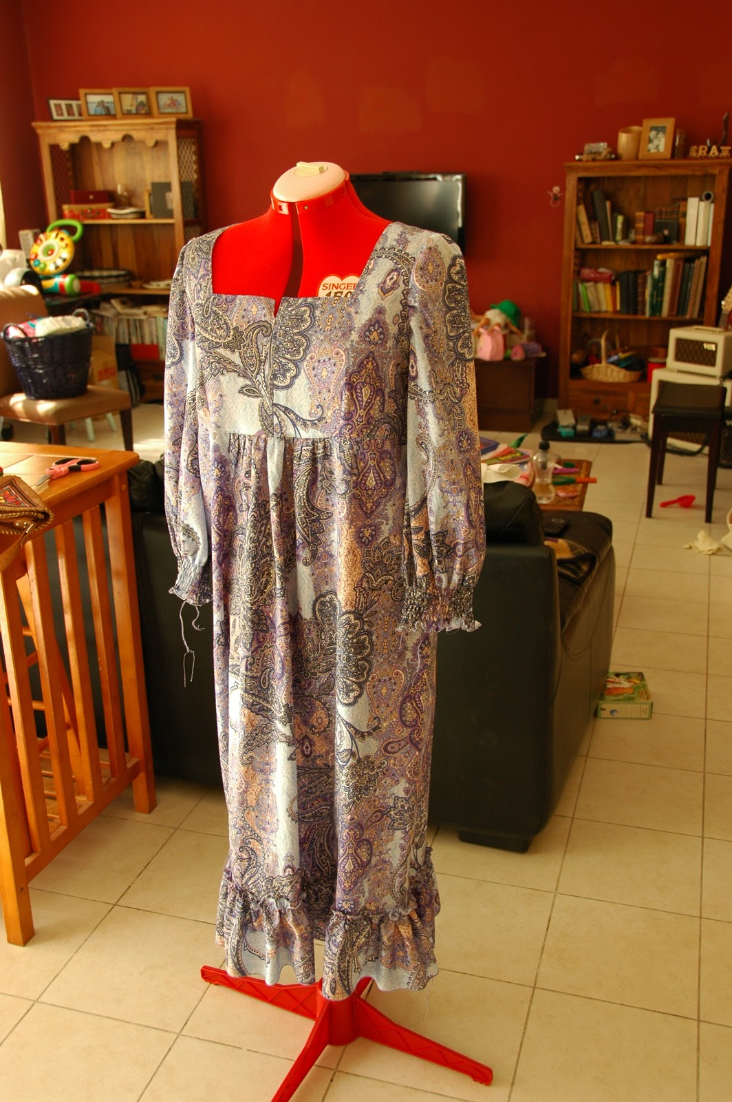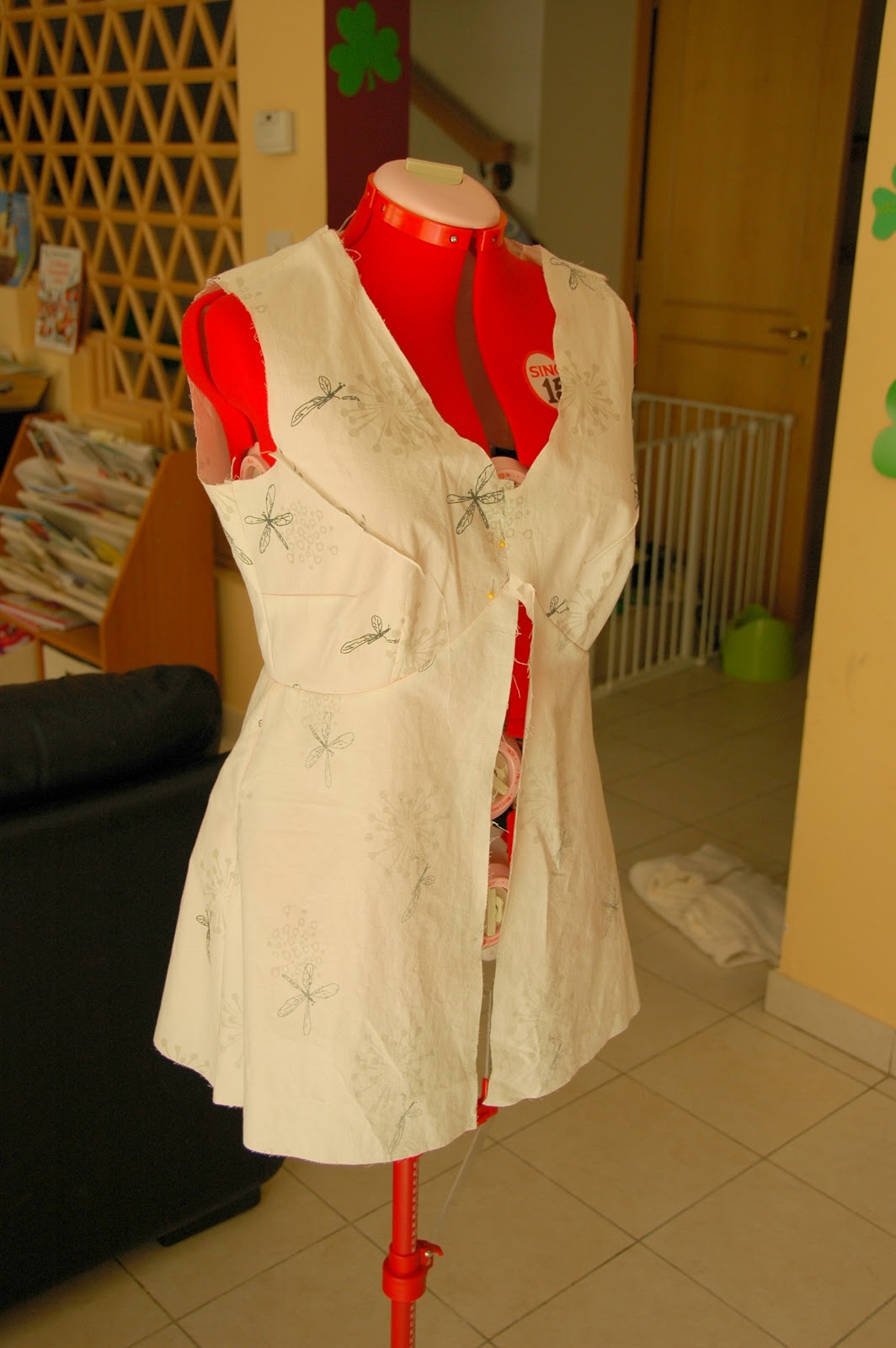 Biedzot ir gatava (vēl tik jāievelk pāris diegu gali) Plūmītes EŠS projekta kleita. Kas lēni nāk, tas labi nāk , tā teikt. Uz manekena šī kleita izskatās ļoti nopietna un tantiska, bet uz adresāta rumpja nav tik traki:) Drīzāk kaut kas no puķu bērnu tematikas.