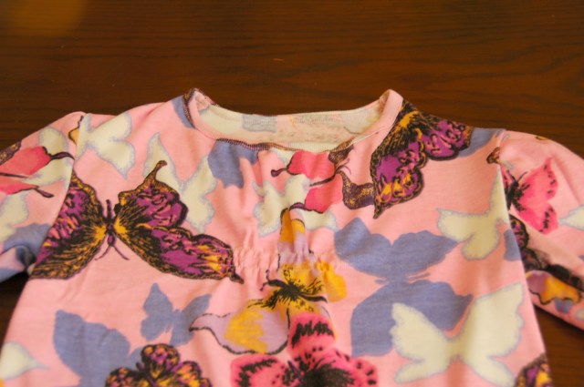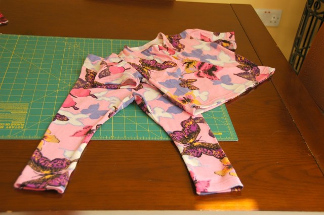 Legingi jau ir pieņemama garuma. Topiņam izvēlējos nedaudz citādāku kakla izgriezuma apstrādi. Bildē īsti nevar saprast, bet dzīvē ir tīri simpātiski sakrokots. Nākotnē gan šāda veida apdarei audumu piegrieztu slīpajā diegā, jo,šķiet, ka tādā veidā apkaklīte labāk piegulētu. Redzēsim , kā tas viss izpildīsies mazajai mugurā. Jā, un piedurknes ir nedaudz sakrokotas, lai topiņam piešķirtu nedaudz meitenīgu toni. Taureņi, taču:)