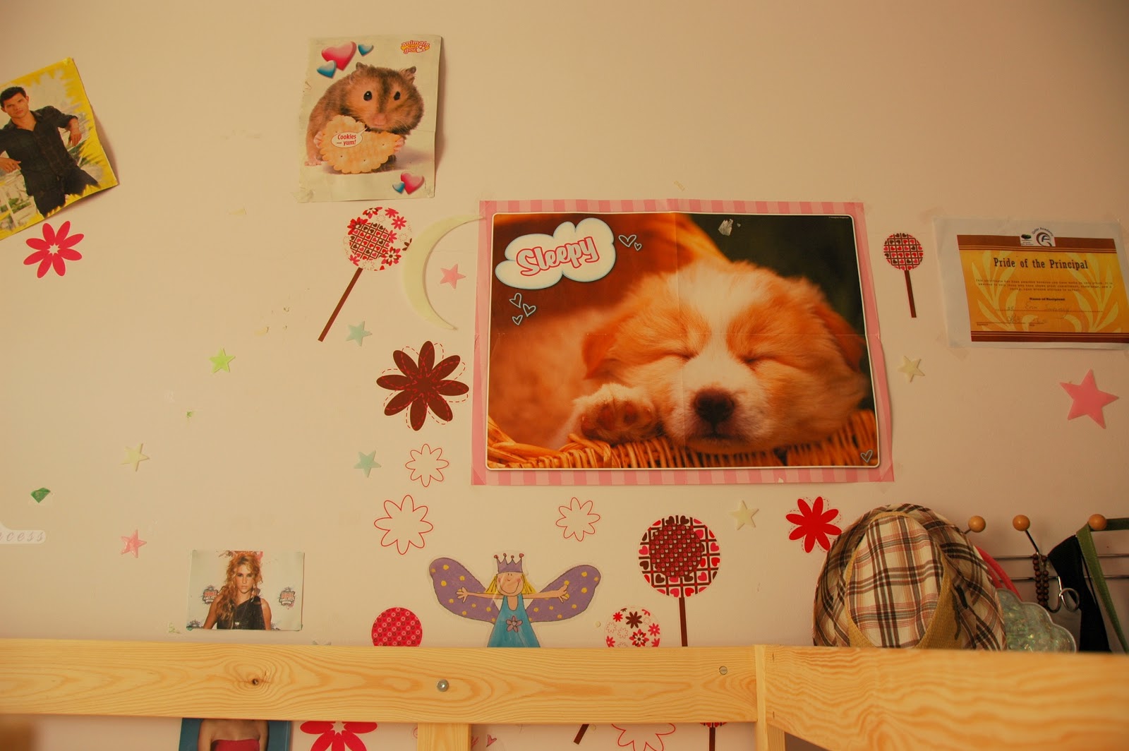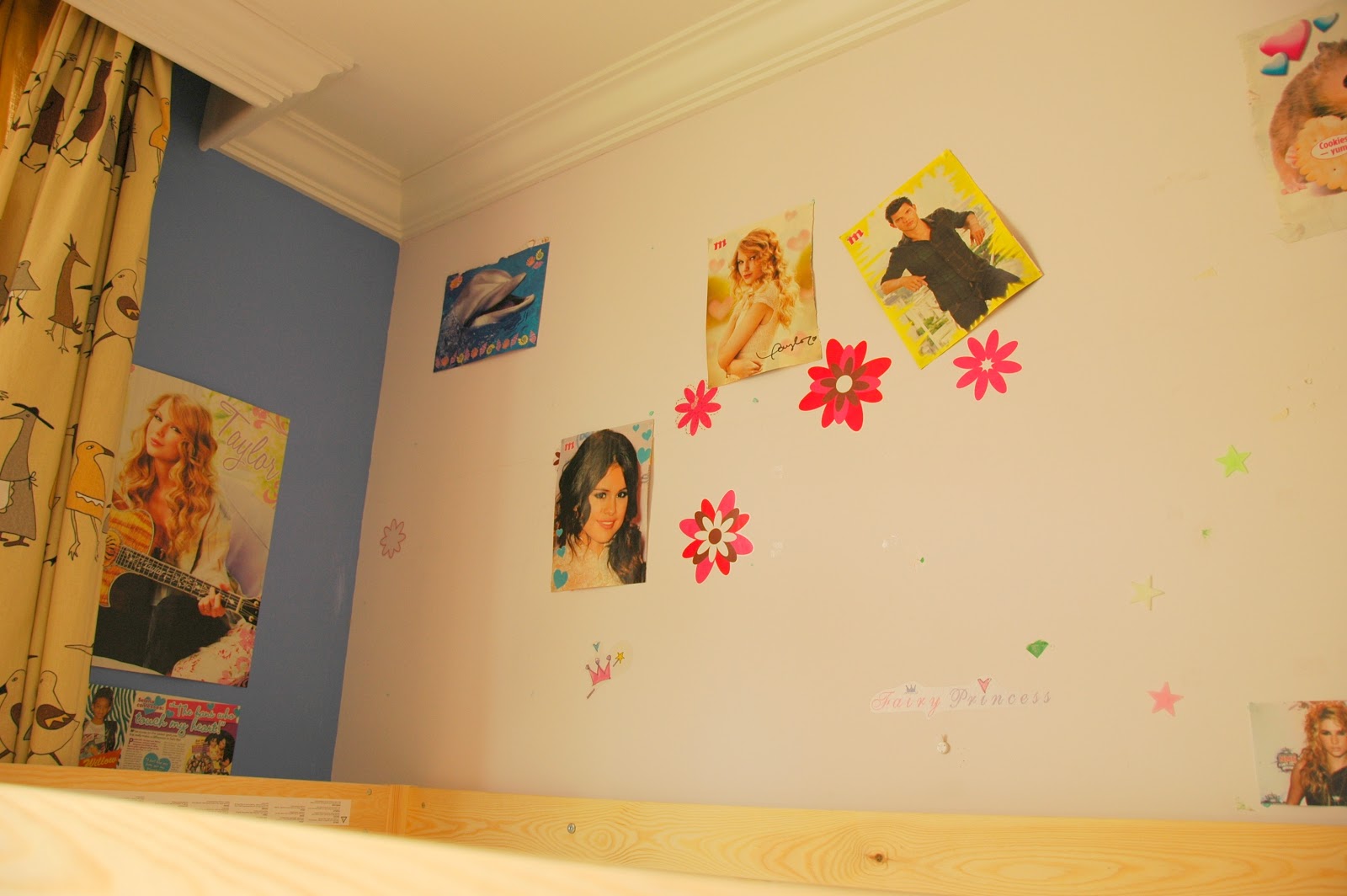 Manas tvīnes sienas dekori. Joprojām mēģinu diplomātiski pierunāt kaut kā šo raibumu minimizēt:) Vispār jau es meitai savā istabā ļauju izpausties kā vien viņai tīk, ar norunu, ka ugunskuru istabā viņa nekurinās un ēst arī ēdīs tikai pirmajā stāvā:) Uzminiet, kurš no maniem bargajiem nolikumiem tiek pārkāpts?:)
