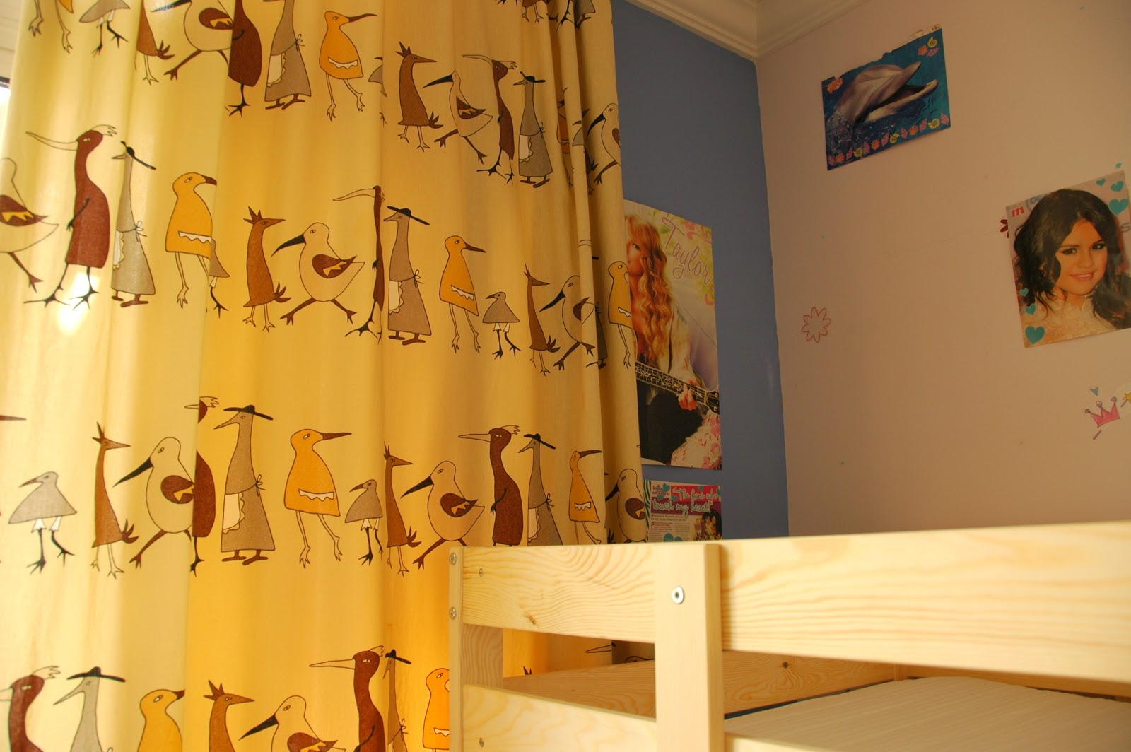 Un sen, sen šūti aizkari no igauņu kokvilnas. Jokainie putni vēl joprojām patīk – man, ne manai meitai:) Esot par bērnišķīgiem…