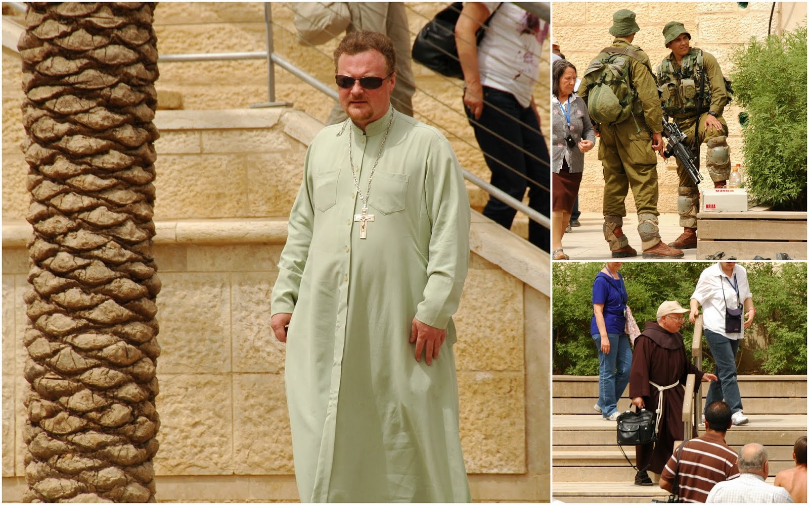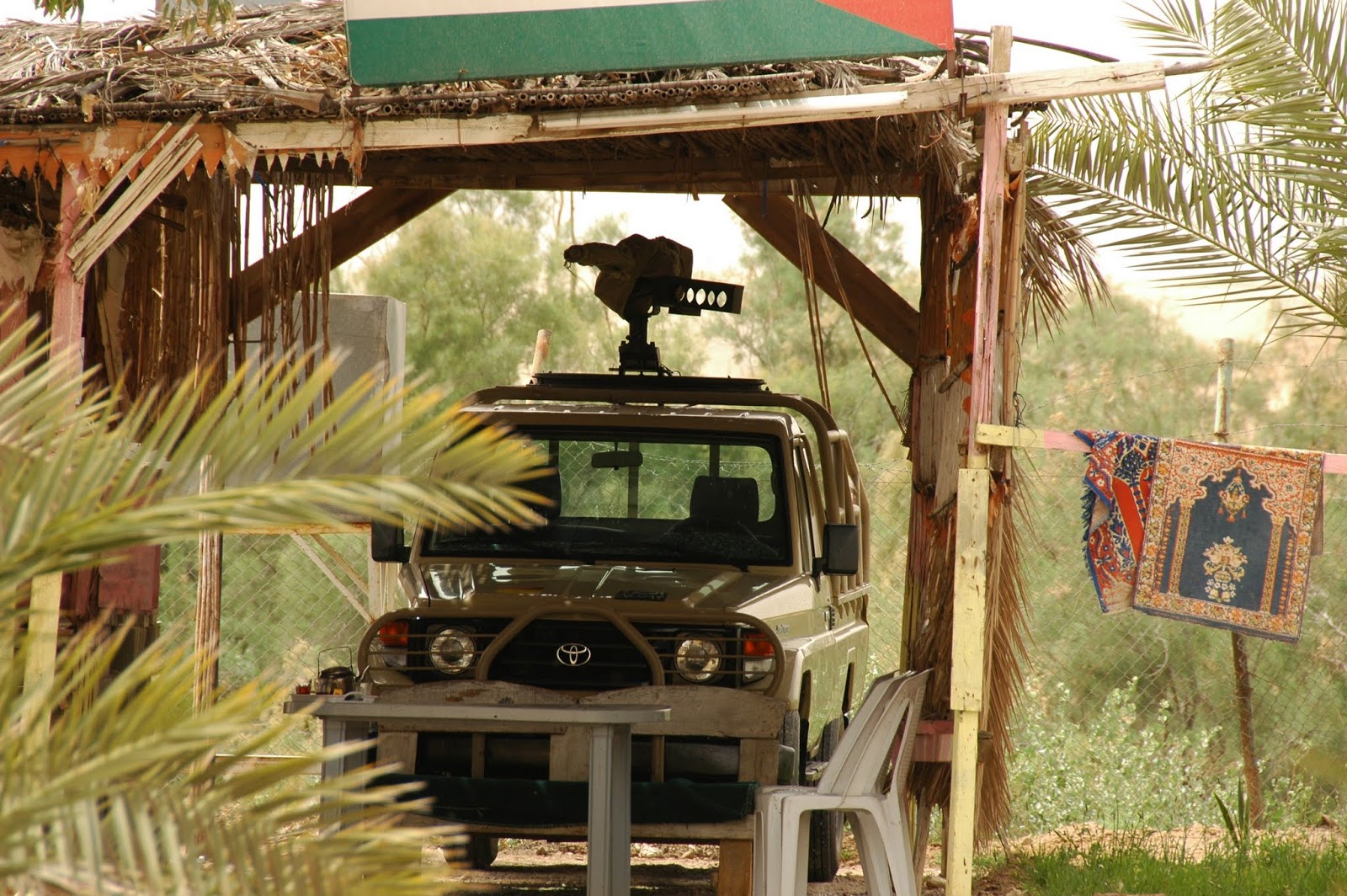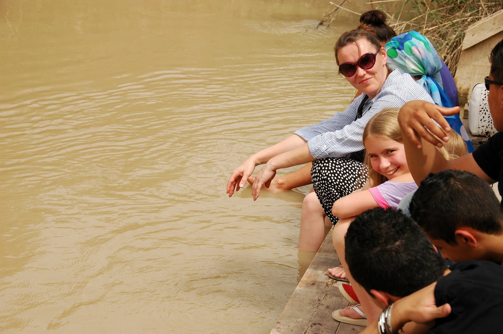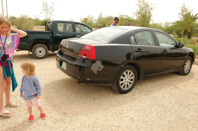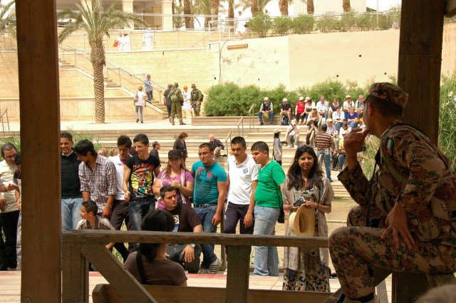 Mēs sēžam Jordānijas pusē, pāri upei Izraēla. Militāro klātbūtni nevar nemanīt. Skat augstāk bildi ar ložmetēju, kas paslēpies uz mašīnas jumta zem ēnainas nojumītes. Nojumītei blakus vēdinās lūgšanu tepiķītis. Mūsu gids kaut ko pārspriež ar Jordānijas robežsargu, kamēr mēs atvēsinamies ledusaukstajā Jordānas upes ūdenī.