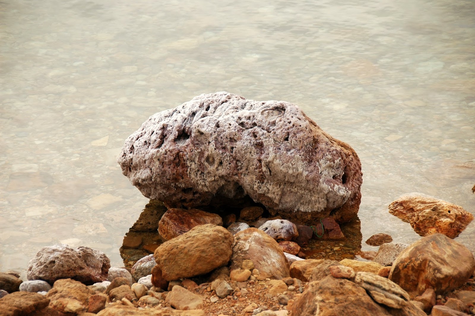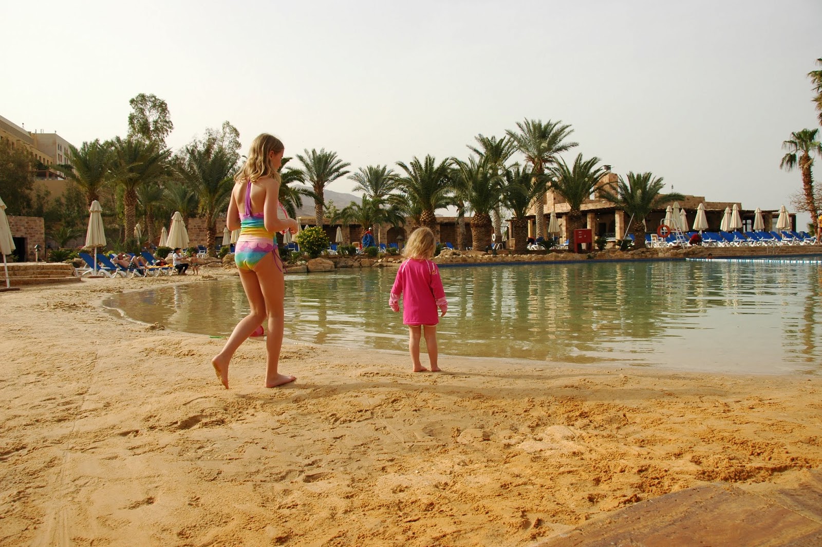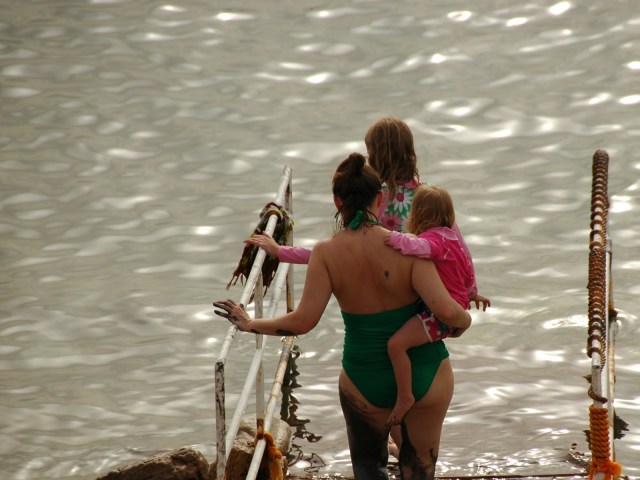 Mūsu meiteņu trijotne pirms peldes sāļajā un veselīgajā Nāves jūras ūdenī. Ne par velti pats Herods ir veldzējies Nāves jūrā, lai ārstētu psoriāzi. Ūdens ir tieši tāds kā bildē – nedaudz eļļains un biezs. Turpat komplektā arī tiek piedāvāti Nāves jūras dubļi, ar kuriem var ieziesties pēc sirds patikas. Tie paši dubļi, kurus naski uzņēmēji pārstrādā, sapilda burciņās ar smukām etiķetēm un pārdod pa visai smukām naudiņām.