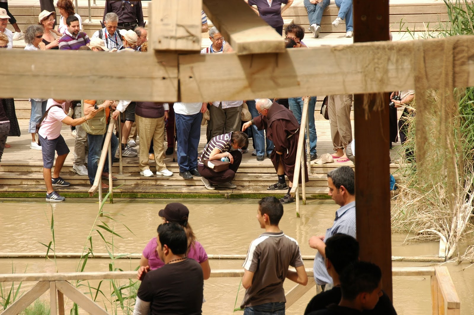 Upes otrā pusē notiek kristības un manāma pacilāta noskaņa. Ir taču Lieldienu rīts, un daudziem svētceļniekiem šāda iegremdēšanās Jordānas upē līdzinās Mekas apmeklēšanai musulmaņu pasaulē. Es arī, vieglas eiforijas ietekmē, izpeldinu savu kreklu. Man gan nav jau iepriekš sagatavota plastmasas maisiņa un tikai šai procedūrai veltīta krekla ar speciālu apdruku, bet arī svītrains krekls no Marks&Spenser šim nolūkam derēs. Un derēja arī vēlāk, kad to slapju uzvilku mugurā, jo tas ļoti labi mani atvēsināja virs + 30 grādu tveicītē busiņu gaidot.