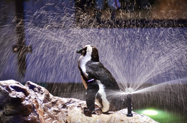 Nebrīvē esošie pingvīni tik ļoti esot pieraduši pie vienmēr gatavajām maltītēm, ka savus zivju ķeršanas instinktus labprāt trenē ar cilvēku palīdzību. Bildē redzamā uzparikte ir ar lāzeru vadāma “zivtiņa”, kuru pingvīni dzenā ar lielu entuziasmu. Cilvēkbērniem prieks un pingvīniem neliels fitness – simbioze, laikam.