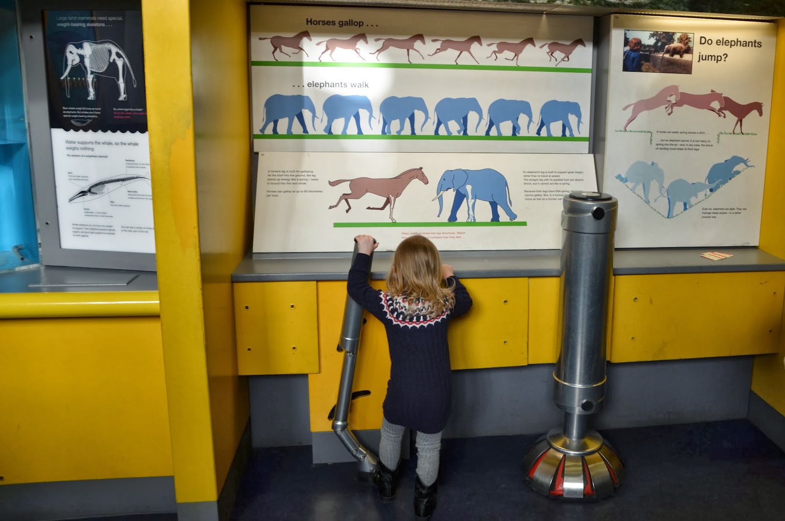 Hidrauliskas zirga un ziloņa kāju imitācijas, ar kuru palīdzību muzeja apmeklētāji var pārliecināties, cik tad daudz spēka ir nepieciešams, lai iekustinātu minētos dzīvniekus. Ar zirga kāju vēl gāja kaut cik veiksmīgi, bet ziloni gan mums neizdevās iekustināt. Tagad vēl jo vairāk spēju novērtēt to prātam neaptveramo grāciju, ar kādu ziloņi pārvietojas.