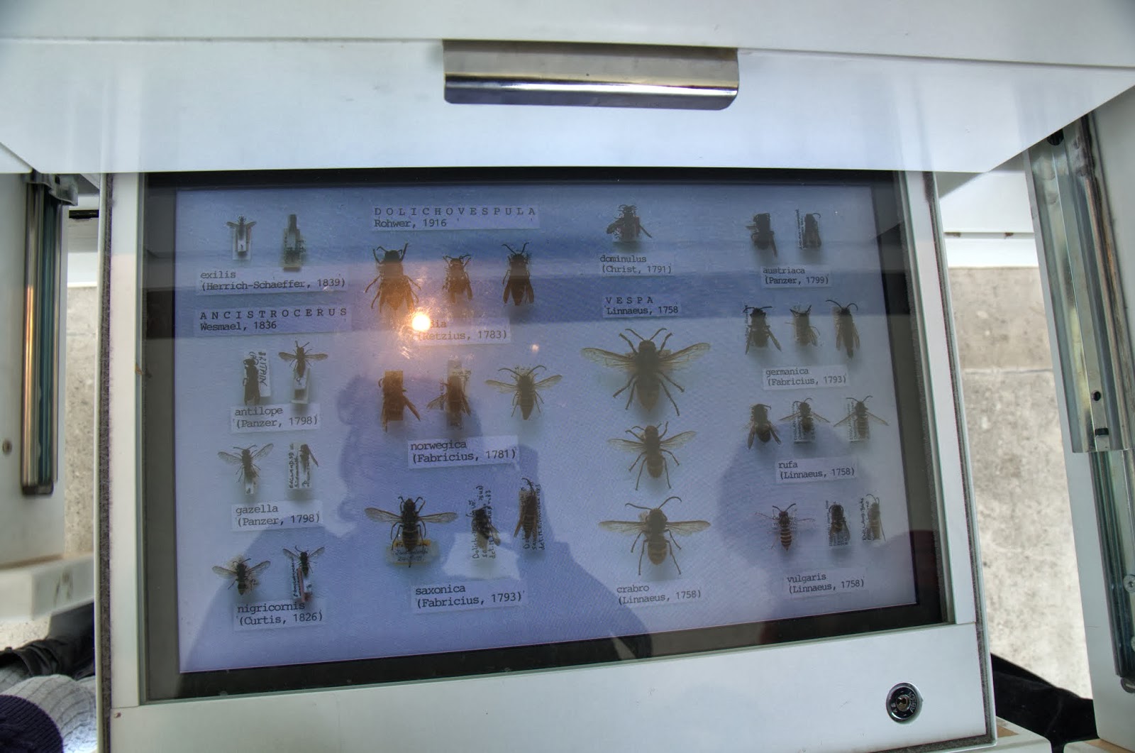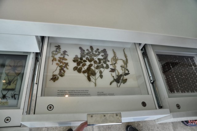 Pavisam necilas atvilknītes, bet mani tās uzrunāja. Proti, žetonu dodu muzeja eksponātu organizētājiem par šo izdomu kopā samiksēt klasisko herbāriju/kukaiņu izstādīšanas metodi un digitālo trīsdimensionālo displeju (bilde, kurā var redzēt manu atspulgu), kur ik pa brīdīm atvilknes iekšpusē pārskrien it kā dzīvs kukainis.