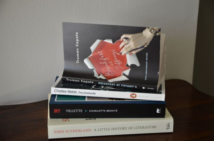 Tālāk seko neliela randomā iegādātu grāmatu kaudzīte. Pirmās divas no augšas paķēra mans cienītais. Apakšējās divas ir manis izvēlētās. Breakfast at Tiffany’s un The Graduate laikam nekādus komentārus neprasa. Breakfast at Tiffany’s es jau esmu izbaudījusi audioformātā Michael C. Hall izpidījumā (ļoti pat iesaku), bet The Graduate gan noteikti izlasīšu, kaut vai lai pārliecinātos, vai darba ekranizācijā sadzirdamā ikoniskā frāze “No, it’s not. It’s completely baked” patiešām ir arī grāmatā.